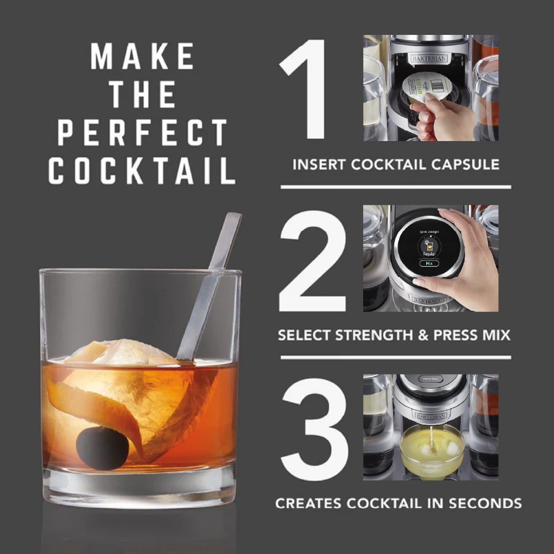 Bartesian makes lounge-quality drinks at the push of a button and delivers all of the benefits of a fully-stocked bar in one sleek and compact machine. Each fully recyclable cocktail pod is packed with the highest quality, all natural ingredients including the bitters, essences, juices, and ingredients needed to make the perfect cocktail in seconds. Simply stock the Bartesian with your favorite vodka, whiskey, rum, gin and tequila, insert a cocktail capsule, select your drink strength and Bartesian does the rest.